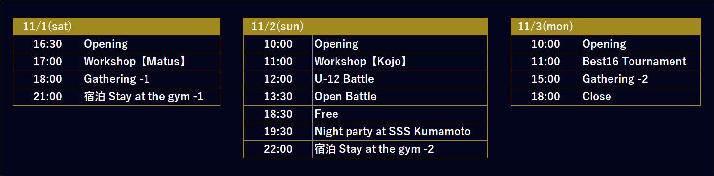 MC:DAISUKE Judge:SAM KOJO / REIJI / ETHAN TURNER / TAKA / ZHOU QUAN DJ:coming soon |